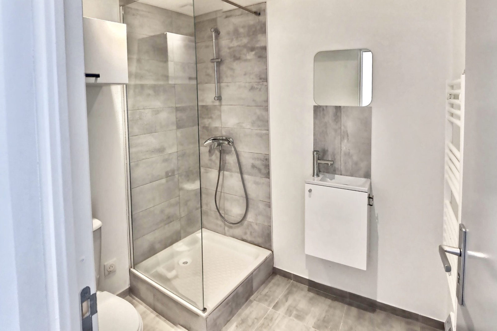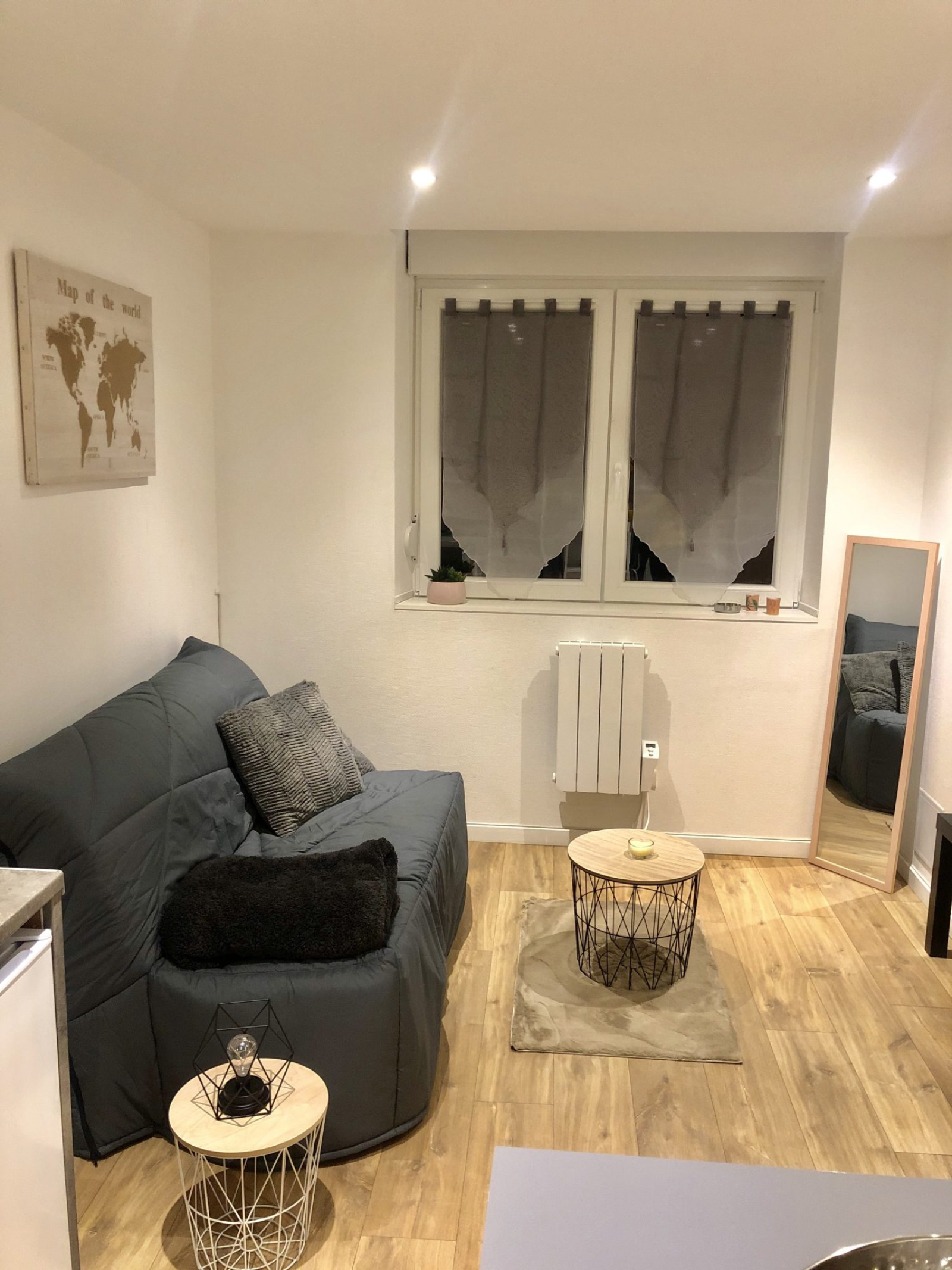 En rdc: studio meublé de 18m2 comprenant : une entrée, une cuisine équipée et intégrée, une pièce de vie, une salle de douche avec wc.