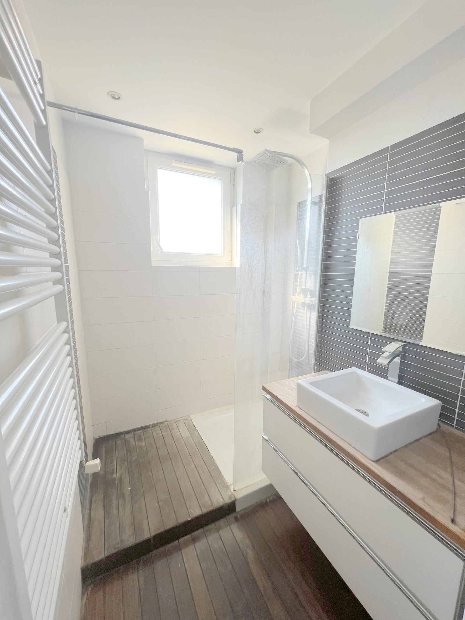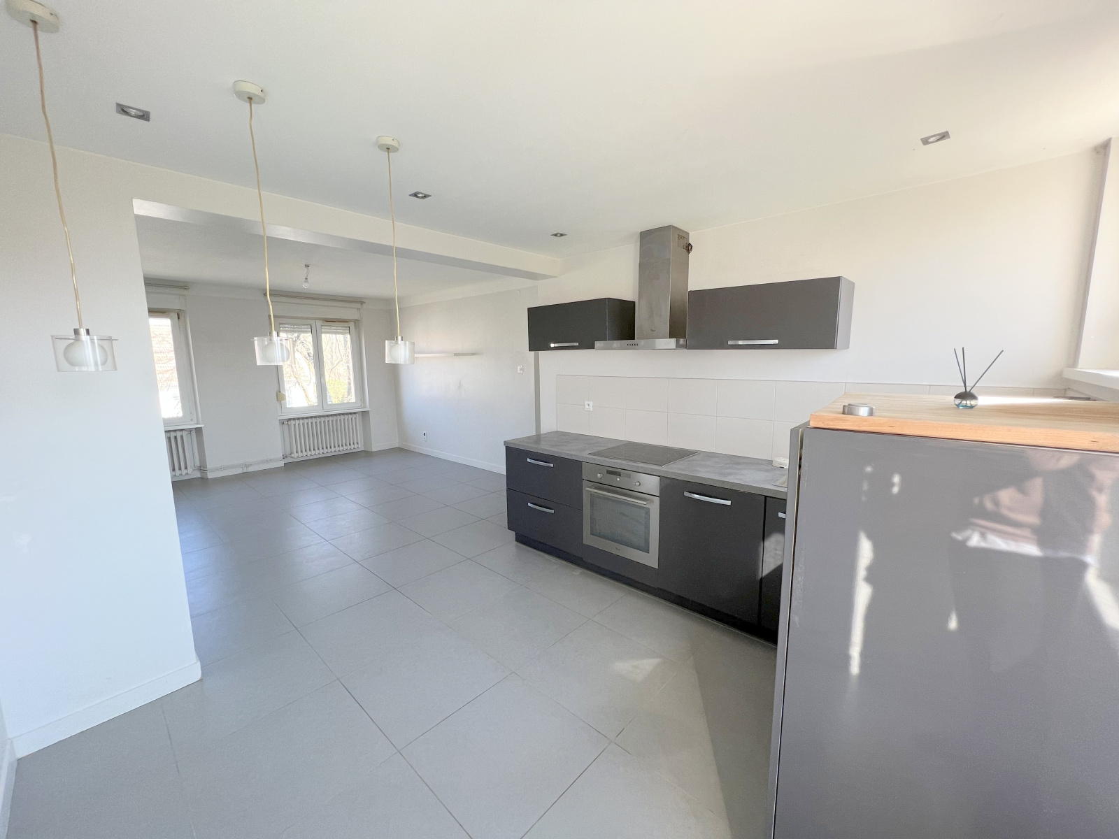 Au rdc : F3 de 62 m2 entièrement rénové comprenant une entrée, une cuisine équipée intégrée ouverte sur séjour et accès terrasse, deux chambres, salle de douche, wc.