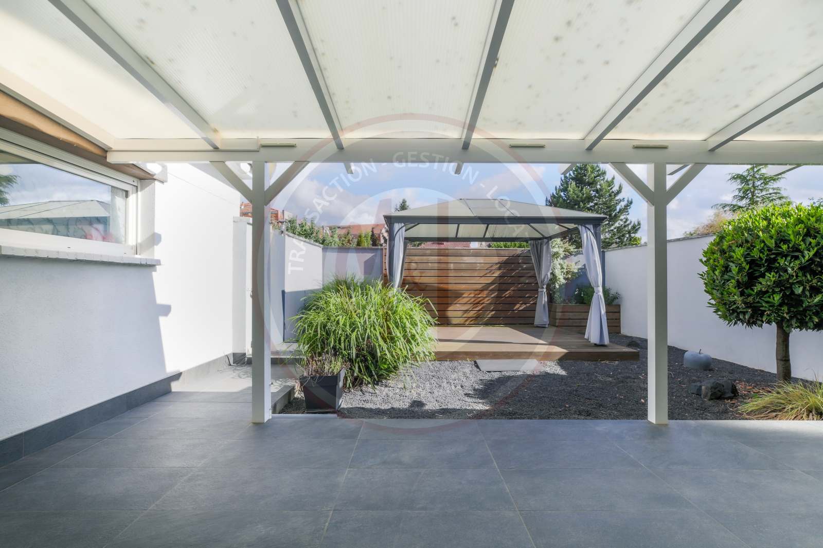 Côté extérieur, cette maison dispose d'une belle terrasse carrelée, d'un garage de 14m2 ainsi qu'une cours à l'avant.
